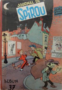 Spirou. Album 37. 14e Année, n° 677 à 681. 5 Avril - 3 Mai 1951. Album in-4, cartonnage éditeur dos rouge, plat illustré. Très légers frot- tements. Traces anciennes d'adhésif en marges de quelques numéros, cahiers un peu décalés. Ni...