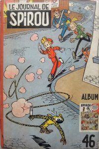 Spirou. Album 46. 16e Année, n° 794 à 806. 2 Juillet - 24 Sep-tembre 1953. Album in-4, cartonnage éditeur dos rouge, plat illustré. Manque en bas du dos sur 3,5 cm, plats et coins légèrement frottés. Bon état intérieur. Hebdomadaire de 24...