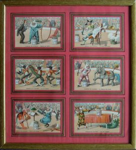Cirque. Réunion de chromos Liebig : Série complète de 6 chromos intitulées Farces de Clowns, publicité Liebig. Encadré.