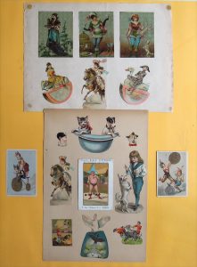 Cirque. Réunion de chromos : Réunion de 17 pièces, chromos et découpis, la plupart sur le thème du cirque présentées dans un cadre moderne.