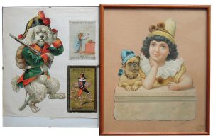 Chiens. Réunion de deux grandes chromos : Réunion de 2 grandes chromos, l'une représenant un chien soldat et l'autre un chien dans les bras d'un enfant. Encadrées.