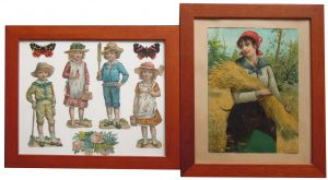 Enfants. Réunion de deux cadres contenant des chromos : Jeune paysanne (haut. : 25 cm) et composition avec des enfants (haut. : 16,5 cm) et des papillons. Encadré.
