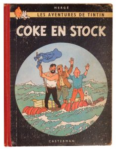 Hergé. Coke en Stock. Paris, Casterman, 1958. Dos toilé rouge. 4e plat B 24. Frottements sur les plats, coiffes, coupes et coins usés. Grande déchirure restaurée sur la page de titre, taches brunes sur 4 ff. Bonne tenue. Edition originale...