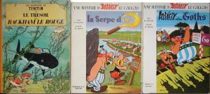 Hergé, Goscinny. Réunion de trois albums : • Hergé. Le Trésor de Rackham le Rouge. Casterman, 1963. Dos demi-toile jaune, 4e plat B 34. Coiffes et coins usés. Exemplaire en partie déboîté, intérieur propre. • GOSCINNY, UDERZO. La Serpe...
