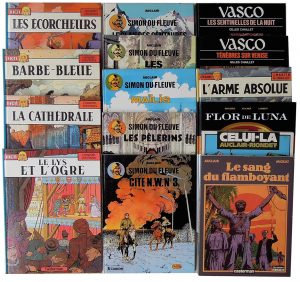 Casterman, Collec-tion « les romans (asuivre) », 1989. Album souple, en noir. Bon état. • Auclair - Migeat. Le Sang du Flamboyant. Casterman, Collection « les romans (asuivre) », 1985. Album souple, en noir. Bon état. • Boisserie. Stalner. Lambert. Flor de Luna : 3. La Fabrica. Glénat, 2009. • Chaillet (Gilles). Vasco. Ed. du Lombard. 2 albums : 4. Les Sentinelles de la nuit (1986). 6. Ténèbres sur Venise (1987). • Martin (J.) - Pleyers (J.). Les Aventures de Jhen. Caster-man, 1984-1986. 4 albums en très bon état : Les Écorcheurs. Barbe-Bleue. La Cathédrale. Le Lys et l'Ogre. • Martin (Jacques) - Chaillet (Gilles). Lefranc. Casterman. L'Arme absolue. (1 982). Déchirures recollées sur le premier plat.