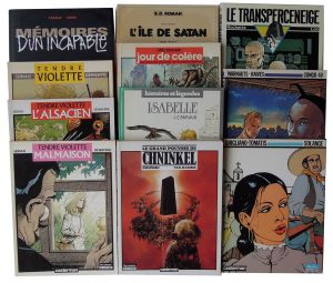 • Kresse (Hans G.). L'Ile de Satan. Dargaud, 1 982. Album souple, en noir. Petite déchirure en bas du premier plat, pelliculage abîmé au 2e plat. • Manara (Milo). Jour de colère. Les Aventures Africaines de Giuseppe Bergman. Casterman, Collection « les romans (asuivre) », 1 983. Album souple, couverture défraîchie. • Rochette - Lob. Le Transperceneige. Casterman, Collec-tion « les romans (asuivre) », 1984. Album souple, bon état. • Rosinski. Van-Hamme. Le grand Pouvoir du Chninkel. Casterman, 1988. Album souple. Pliures en couverture. Intérieur propre. • Servais (Jean-Claude) - Dewamme. Tendre Violette. Cas-terman, 1981 . Album souple, un peu défraîchi. Malmaison. 1981 . Album souple. Isabelle. Ed. du Lombard, 1984. L'Alsacien. Casterman, 1986. • Warnauts - Raives. Congo 40. Casterman, Collection studio (asuivre), 1988. Album souple, bon état.
