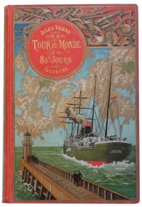Verne (Jules). Le Tour du Monde en 80 Jours. Dessins par Mm. de Neuville et L. Benett. Paris, Hetzel, (imp. Belin), s. d. (v. 1900). Grand in-8, cartonnage éditeur percaline rouge type « au steamer », pastille rouge. Dos légèrement passé, coins...