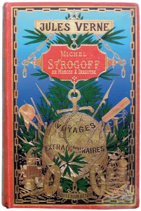 Verne (Jules). Michel Strogoff. Moscou - Irkoutsk. Suivi de Un drame au Mexique. Dessins de J. Férat gravés par Ch. Barbant. Paris, Hetzel, (imp. Belin frères), s. d. (vers 1902). Grand in-8, cartonnage éditeur percaline rouge type « au globe...