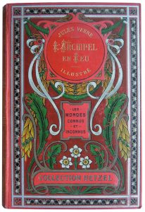 Verne (Jules). L’Archipel en Feu. Illustrations par Benett avec grandes gravures en couleurs. Paris, Hetzel, s. d. (v. 1910). Grand in-8, cartonnage percaline rouge « aux feuilles d'acanthe », tranches dorées. Petites déchirures le long des...