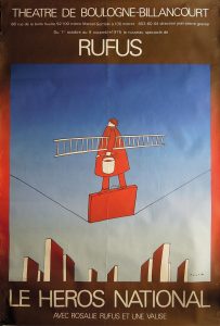Folon. Rufus. Le Héros National. Théâtre de Boulogne-Billancourt. Du 1er octobre au 9 novembre 1975. Affiche en sérigraphie 119 x 80 cm. Plis légers, petite déchirure d'1 ,5 cm en marge gauche. Entoilée.