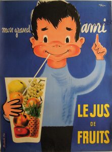 Rioux (J.P.). Au moins 2 centilitres d'al-cool . dans chacun de ces verres ! Pru-dence. C.N.D.C.A. Creat. Michels Fils, s. d. 57,8 x 38,2 cm. Trous de punaise aux angles. Entoilée. • Hage (?). Le Jus de Fruits mon grand ami. Michels Fils, v. 1950. Belle affiche 79 x 58 cm. Annotation au feutre en tête au verso visible par transparence, déchirure de 5 cm en tête scotchée au verso. On joint : Journée Nationale des Vieillards. Imp. Darboy, 1 958. Affiche 40 x 30 cm, signée Kersubiec. Trous de punaise.