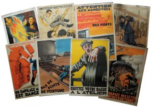 le feu à l'entrée d'un tunnel. N° 68. Les vapeurs d'essence sont inflammables. N° 74. Pas de ponts de fortune. Signé Oliv. 35. N° 117. Débarrassez les passages. Signé Olivier. N° 119. Un empilage mal fait est dangereux. Olivier 31 . (2 ex.). N° 1 27. Pas de jeux à l'atelier. Signé Olivier 33. Format moyen : 60 x 40 cm. Qq. pliures, trous de punaise, déchirures marginales. Affiches signées Olivier pour la plupart, éditées au début des années 30, imprimées à Nantes, Imp. Armoricaine ou Paris, Imp. Mayeur. • On joint : Ne vous penchez pas changez l'échelle de place. S.N.C.F. Jombart, s. d (1949). 39,7 x 29,5 cm. • DURUPT (Maurice). Faites comme ceci et non comme cela. S.N.C.F. Litho-parisienne, s. d (1949). 60 x 40 cm.