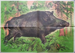 Chasse. Djv Jagdscheibe. Nachdruck Untersagt. Réunion de 3 affiches, 122 x 86 cm en couleurs, signées G. Labenberg, représentant un sanglier, un daguet, un chamois avec une cible esquissée pour s'entraîner au tir à l'arc. Trous de punaise. Bon...