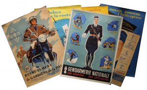 Gendarmerie Nationale. Réunion de 4 affiches : Un moyen nouveau . l’hélicoptère (1931); Faites une carrière dans la . Gendarmerie Nationale; Police de la Route. 3 affiches non signées. 76 x 54 cm. Qq. pliures. • GÉO HAM. Gendarmerie...