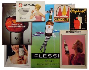 Alcool. Réunion de publicités (cartons et affiche) : • Cognac Hennessy. Deux publicités sur cartons forts, 44 x 32 cm, avec lien de suspension en tête. L'un défraîchi, son support en carton manquant. • Cognac Camus. Plaque métallique, 24 x...