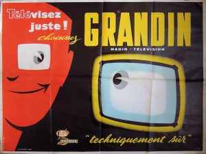 Joli (H. G). Grandin. Paris, Imp. Chauffour, s. d. (vers 1960). Grande affiche sur fond noir : Télévisez juste ! Choisissez Grandin « techniquement sûr ». 116 x 157 cm. Qq. petites déchi-rures sans manque aux pliures, marges un peu froissées.