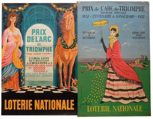 Loterie Nationale. Réunion de deux affiches : • Oberlé (Jean). Prix de l’Arc de Triomphe. Centenaire de Longchamp 1957. Tirage le 5 octobre. Paris, Editions Le Bélier. 60 x 38 cm. Petites déchirures en marge et dans les angles supérieurs....