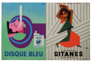 S.E.I.T.A. Réunion de neuf affichettes : • Favre (H.). Gauloises Disque Bleu. Imp. Dufournet. 6 ex. • Morvan (H.). Gitanes Caporal. Imp. Pradel. 3 ex. 9 affichettes sur papier glacé, 33 x 25 cm. Qq. pliures, bon état général.