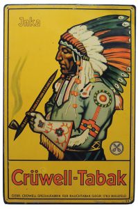 Tabac. Crüwell-Tabak. Inka. Gebr. Crüwel spezialfabrik für Rauchtabak Gegr. 1783 Bielefeld. Années 1950. Panneau en tôle, 36,5 x 24 cm, représentant un indien fumant un calumet sur fond jaune. Qq. éraflures.