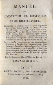 Cardelli. Manuel du Limonadier, du Confiseur et du Distillateur contenant les meilleurs procédés pour préparer le Café, le Chocolat, le Punch, les Glaces . Pommades et poudres cosmétiques. eaux-de-vie. Seconde édition. Paris, Roret et Roussel,...
