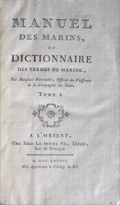 Bourdé de Villehuet (Jacques). Manuel des Marins, ou Dictionnaire des Termes de Marine. A l’Orient, chez Julien Le Jeune fils, 1773. 2 tomes en un volume in-8, reliure de l'époque veau marbré, dos à 5 nerfs orné. Épidermures avec qq. manques,...