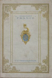 Compagnie générale Transatlantique. Le Nouveau Paquebot « France ». Illustrations de J. Camus. Paris, Éditions du Trèfle, 1947. Brochure in-8, brochée. Couverture cartonnée, plat illustré de motifs dorés (légères pliures dans l'angle...