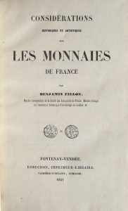 Fillon (Benjamin). Considérations Historiques et Ar-tistiques sur les Monnaies de France. Fontenay, Robuchon, 1851. In-8, reliure demi-basane rouge, dos lisse orné de filets dorés. Qq. frottements. xi-(1 )-251 pp. et 4 planches hors texte. Rares...
