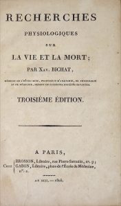Bichat (Xavier). Recherches Physiolo-giques sur la Vie et la Mort. Troisième édition. Paris, Brosson, Gabon, An Xiii - 1805. In-8, reliure demi-basane fauve, dos lisse orné. Épi- dermures, petit trou de vers sur le mors supérieur. xx-347 pp....