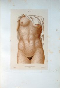 orné de filets à froid simulant des caissons. Ouvrage composé d'un faux-titre, titre et 74 planches en couleurs accompa- gnées d'un texte explicatif en regard, l'en- semble monté sur onglet. Qq. rousseurs. Atlas seul complet des 74 planches saisis- santes illustrant les infections provoquées par les maladies vénériennes sur le corps humain.