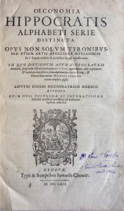 Hippocrate. Foès (Anuce). Œconomia Hippocratis, Alphabeti serie distincta. Opus non solum tyronibus, sed etiam artis apollineæ mystagogis, Et è superiore loco docentibus longè utilissimum. Anutio Fioesio mediomatrico medico Authore. Genevæ,...