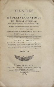 Sydenham (Thomas). Œuvres de Médecine Pratique, tra-duites en français sur la dernière édition anglaise par A.-F. Jault. Nou-velle édition revue. par J.-B.-Th. Baumes. Montpellier, Tournel, 1816. 2 volumes in-8, brochés. Couvertures muettes....