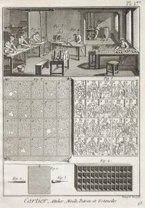 Encyclopédie. Réunion de 12 pl.: • Cartier - Cartonnier. Cartier : Atelier, ou- tils, fabrication des cartes à jouer (6 pl.). Cartonnier : atelier et gaufrure des cartons (2 pl.). Format in-4. • Modelage - Fonderie. 4 planches dont 2 à double...