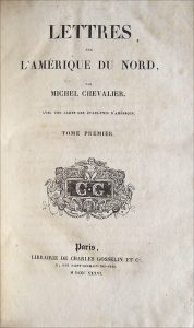 [Amérique]. Chevalier (Michel). Lettres sur l’Amérique du Nord. Paris, Gosselin, 1836. 2 volumes in-8, reliure demi-basane fauve, dos lisse souligné de filets dorés. Épidermures avec manques de cuir sur la coiffe inférieure au t. 1 et sur les...
