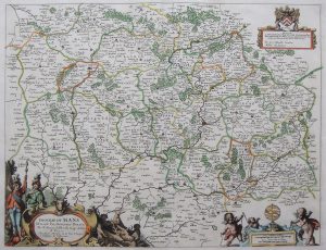 Samson d’abbeville (N). Diocèse du Mans divisé par Doyennés ruraux. Paris, Pierre Mariette, s. d. (1676). Carte rehaussée en couleurs, 37,5 x 49,3 cm à la cuvette. Bel état. Encadrée. Pastoureau [30] p. 419.
