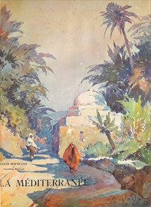 Bertrand (Louis). La Méditerranée. Photographies de Fréd. Boissonnas, Aquarelles de Marius Hubert-Robert. Paris, Alpina, s. d. (1929). In-4, reliure (signée Mériot) demi-chagrin bleu nuit à coins, dos à 4 nerfs, tête dorée. Couvertures et...