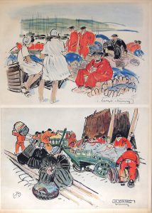 [Bretagne]. Le Roy (Florian). Pays de Bretagne. Aqua-relles de Mathurin Méheut. Paris, Alpina, 1937. In-4, broché. Couverture illustrée. Dos déchiré, copieusement recollé avec du scotch, trace de mouillure le long du mors supérieur. 158-(2)...