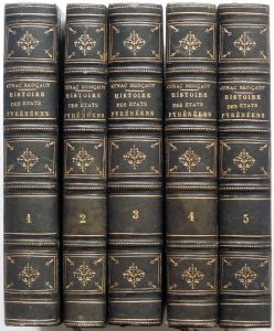 complète des Pyrénées francaises et espagnoles, ornée de 55 gravures. Paris, Amyot, 1860. 5 volumes in-8, reliure de l'époque demi-chagrin noir, dos à faux-nerfs orné. Tomaison des tomes 4 et 5 inversée. T. 1 : (2)-iv-618 pp. T. 2 : (4)- 431-(1) pp. T. 3 : (4)-643-(4) pp. et 8 pl. hors texte. T. 4 : (4)-521-(2) pp. T. 5 : (4)-496-(1) pp. et 32 pl. hors texte. Petite restauration en marge des premiers ff. au t. 1, rousseurs assez marquées sur l'ensemble des volumes. Seconde édition de cette histoire des Pyrénées, la seule illustrée. Bon exemplaire bien relié, complet des 55 figures annoncées, réparties en 40 planches.
