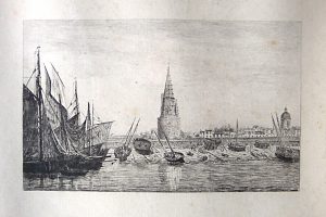 (usagée). Plan de La Rochelle par Georg Braun (1541-1622) et Franz Hogenberg (1535-1590), extrait du « Civitates orbis terrarum » imprimé à Cologne. • Joint : COUNEAU (Émile). La Tour de la Lanterne. Début XX^. Eau-forte (20 x 28 cm à l'assiette) non signée, attribuée à Emile Cou- neau. Qq. piqûres. Encadrée.