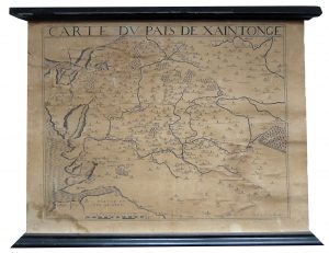 Leclerc (Jean). Carte du Pays de Xaintonge. xviie s. Carte en noir (32,5 x 42 cm à l'assiette), entoilée, tenue entre deux larges baguettes. Papier bruni, petites déchirures. On joint : TASSIN. Xaintes. Première moitié XVII^ Plan de Saintes en...