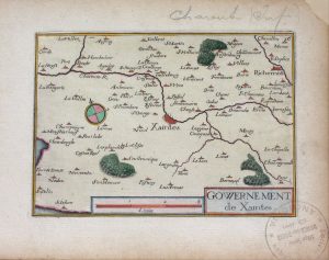 Tassin. Gouwernement de Xaintes. Vers 1634. Carte (10,4 x 15,1 cm au trait) rehaussée en couleurs. Petit manque dans un angle, loin de la carte. Cachet de Société en marge touchant l'angle du cartouche. On joint : Trois vues de Saintes milieu XIXe...