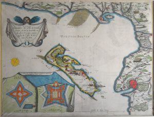 cuvette. Deux petites au-réoles en marge inférieure. Belle carte avec les plans des forts de la Prée et de St Martin en bas à gauche, tirée du Théâtre géographique de Royaume de France. Bel état. Encadrée. Gaudillat p. 117; Pastoureau p. 473.