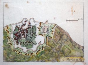 129. Pastoureau [38] p. 443. • St Martin de Ré. XVIII^ Plan rehaussé en couleurs, 11,2 x 15,4 cm au trait. Qq. rousseurs. Encadré. • La Rochelle. XV III ^ Plan rehaussé en couleurs, 17 x 12,7 cm à la cuvette. Rousseurs. Encadré.