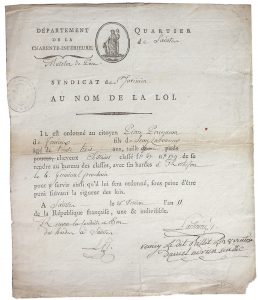 Charente-Maritime et divers. Réunion de documents dont : • Convocation au Bureau des Classes à Rochefort. Saintes, An 2. • Congé pour raisons de santé accordé à deux frères. Saintes, An 7. • Affiches, Annonces et Feuille maritime et de...