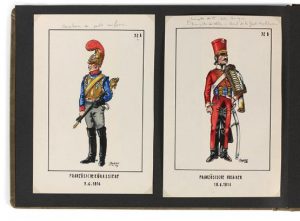 Manuscrit D’elberfeld. 1813-1819. Darstellung der von 9 November 1813 bis zum 14 april 1819 durch Elberfeld passierten Truppen. S.l., s.d., 2 vol. in-4, sous classeur. Avec 236 planches en couleurs (titre inclus).