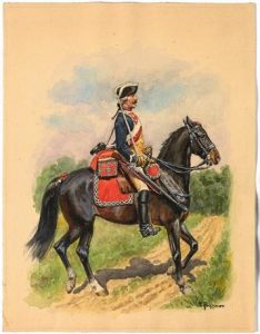 Rousselot (Lucien). Cavalier du régiment de la Reine. Louis Xv. Aquarelle. On yjoint des calques. 32 x 26 cm.