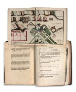 dos à nerfs, orné, tr. rouge. Edition Originale. Très jolie vignette en couleurs, en tête de la dédicace, aux armes du Duc de Châtelet, Colonel du régiment du Roi, où l’auteur était lui-même officier, et 11 grandes planches repliées, gravées par Louis-Martin Bonnet, d’après les dessins de Fosse et imprimées en couleurs. L.M. Bonnet, inventeur de différents procédés d’impression en couleurs, trouva pour cet ouvrage, la manière d’opérer pour imprimer les cartes ou plans, en un grand nombre de couleurs. Reliure très usagée, déchirure de moitié au faux-titre avec mq., petite galerie de vers aux premières pages, mouillures sur les contre-plats.