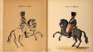 de 98 planches fac-similés, exécutées à l’aquarelle sur l’originale par Lucien Rousselot, montées sur onglets pour une réunion de 10 amateurs, tous nominatifs (Monsieur Paul Roulleau). Il comporte de nombreux calques de Rousselot. Un ou deux personnages à pied ou à cheval en pleine page sans fond. En grande partie inédits. Précieuse documentation. Ce sont les soldats de « la Grande Armée » de cette époque en tenue de campagne. On yjoint 5 planches en couleurs des fantassins et des cavaliers.