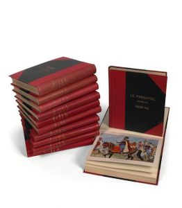 Passepoil (le). Bulletin de la Société d’étude des uniformes. Strasbourg, 1921-1950, 30 années reliées en 12 vol. in-4, demi-rel. à coins toile rouge un peu frottée, dos insolés. Collection complète de cette belle revue sur le costume