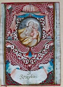 (1). "Éclairé de vos lumières, animée par vos vertus, tous ces coeurs ne vivent que pour Jésus". Extrêmement fines découpes cernant divers petits sujets aquarellés, sur papier, 14 x 11 cm (couleur blanche du sujet central part. plombée). Représente sainte Claire recevant du pape la confirmation de son privilège (?).-- (2). "S. Thöresia" [sic]. Découpe et aquarelle, sur peau de vélin, 17 x 10 cm (qqs pet. manques de couleurs au sujet central).-- (3). "S. Josephus". Découpe et aquarelle, sur peau de vélin, 15 x 9 cm.