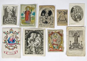 18e s. - 1re moitié 19e s. Sur peau de vélin (34 dont 3 rehaussées), papier (62 dont 13 rehaussées), tissu (2 dont 1 en allemand). Images de saints et saintes, lieux de pèlerinage, prières, scènes de la vie du Christ, etc., dont : 5 PIÈCES ORIGINALES : Coeur de Jésus. Aquarelle ajourée sur peau de vélin.-- "S. Josephus". Canivet sur peau de vélin, 18e s.-- Enfant-Jésus. Piquetage sur papier, 18e s.-- "S. Barbara". Aquarelle sur peau de vélin.-- Bouche saignante avec prière en néerlandais, sur papier.